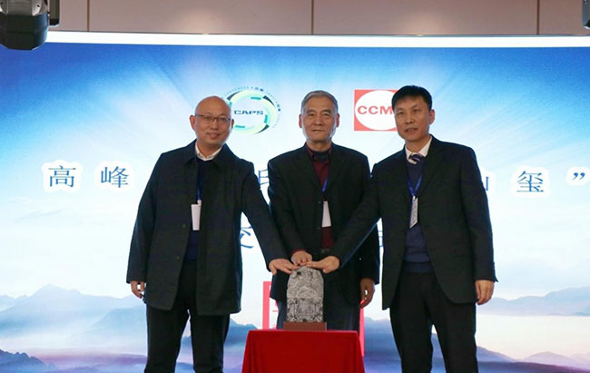 中國(guó)工程機(jī)械工業(yè)協(xié)會(huì)筑養(yǎng)路機(jī)械分會(huì)會(huì)長(zhǎng)焦生杰(中)的見證下,河南亞龍智能裝備有限公司總經(jīng)理張大禹向吉林省公路機(jī)械有限公司總經(jīng)理邵永祥移交峰會(huì)印信“泰山璽”。